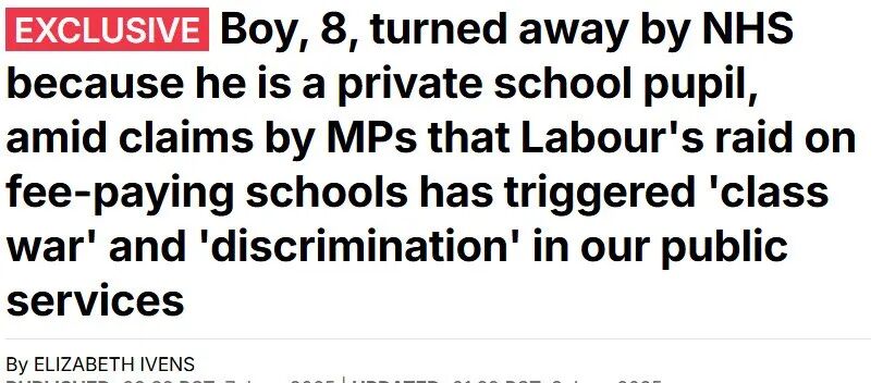 如今,这样的担心似乎被进一步坐实了:据媒体消息,一名8岁男孩因为就读私立学校,被NHS拒诊了。