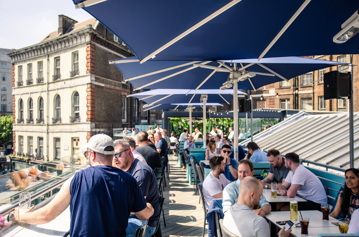 位于维多利亚车站正对面的 Market Halls,拥有一个宽敞且位置绝佳的顶楼露台。 这里不卖弄华丽的景观(除非你特别喜欢观察伦敦著名的红色巴士),但它卖的是一种无与伦比的便利性与多元选择。 楼下是各色街头美食摊位,你可以带着烤串或披萨来到顶楼,点一杯精酿啤酒或调酒,享受一个露天的欢乐时光。 艾编觉得这里就像是维多利亚车站里Wetherspoons的高级进化版,更时髦、更有氛围感,且选择更丰富。 对于刚下班想找个宽敞地方跟朋友聚聚,或是搭火车前想吹吹风的小伙伴来说,这里就是你的高空食堂。