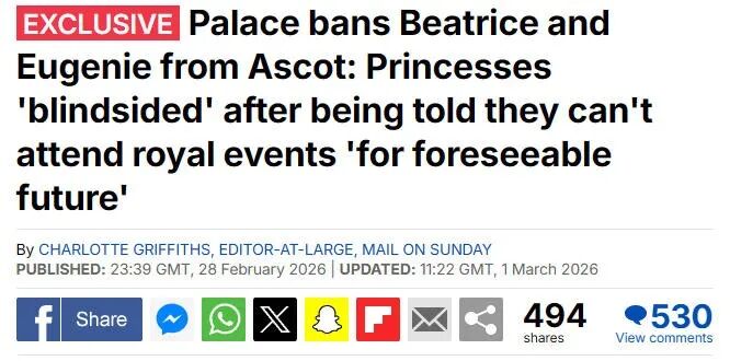 据英国《星期日邮报》率先报道,王室已经给碧翠丝和尤金妮下了通知,今年不能出席王室赛马会。