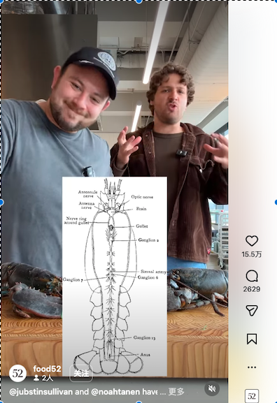 视频截图:社交网站上,人们在宰杀龙虾前仔细学习其身体构造。