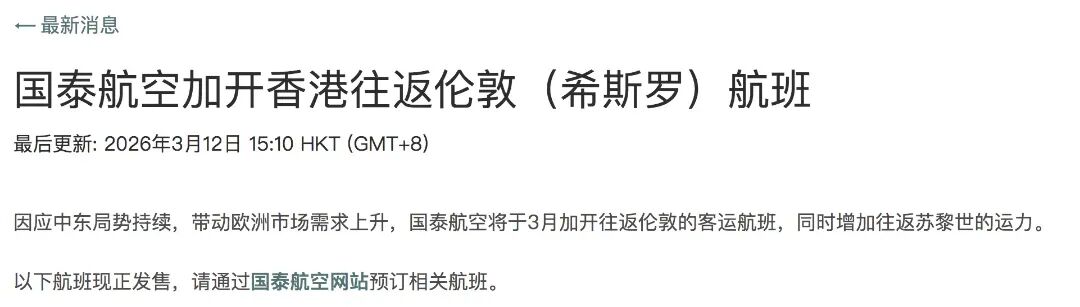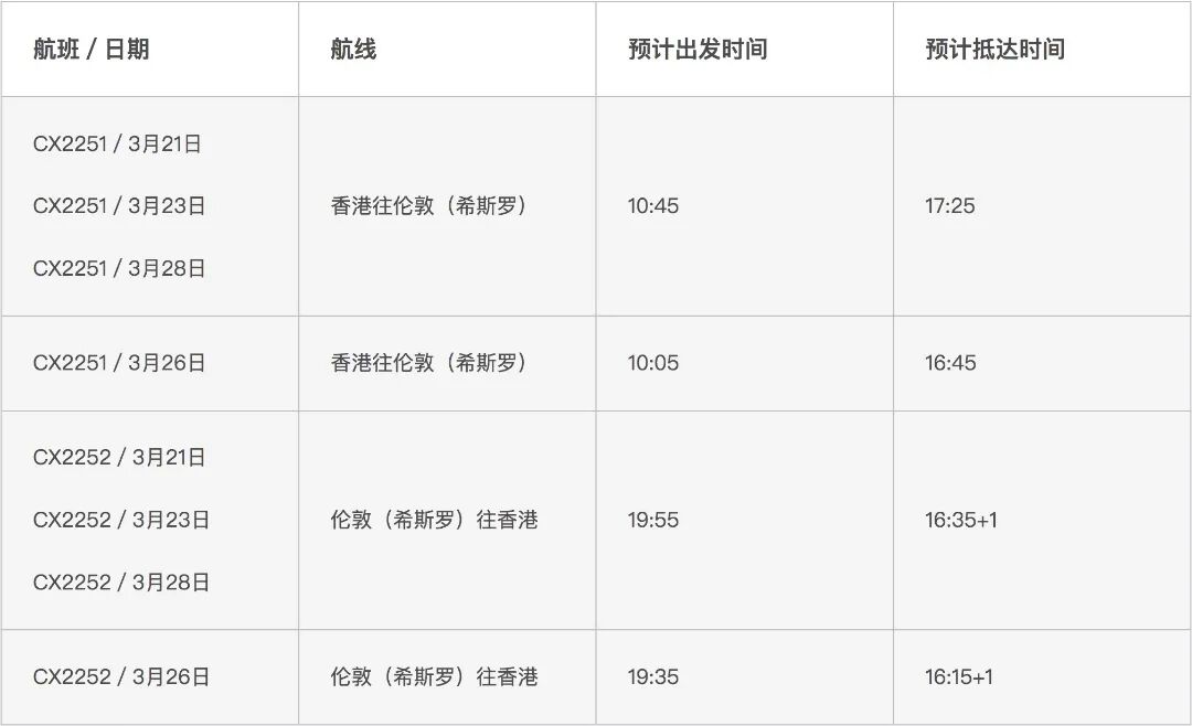 此外,考虑到中东航线飞不了的问题,国泰航空今日宣布:加开3月香港往返伦敦的航班。