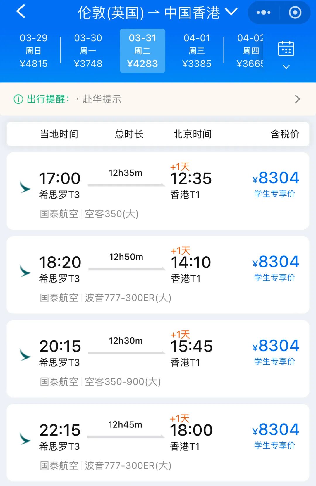 如果还是有小伙伴,想这个月底趁着假期回国,可以考虑走香港转机,国泰航空有学生专享价能便宜点。