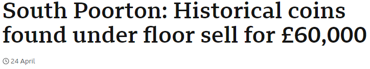 比如2022年,北约克郡小村Ellerby一对夫妻在装修厨房的时候挖出了古钱币,最后卖了75.4万英镑。