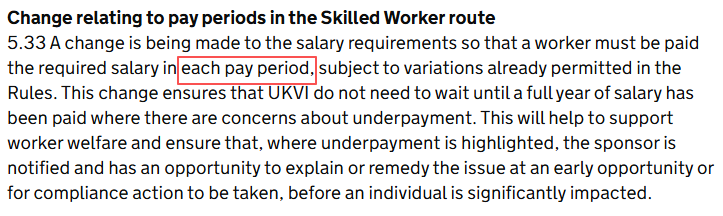 简单来说,比如员工是每月发一次工资,那么每个月发的工资都必须符合规定的标准。而移民规则允许的一些合理调整(例如浮动奖金、加班等)依然有效,但要求是每个周期都要达到标准。