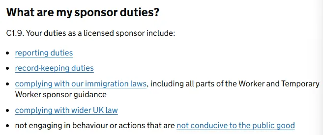 • 遵守英国移民法律,包括《工作签证及临时工作签证担保人指南》的所有内容