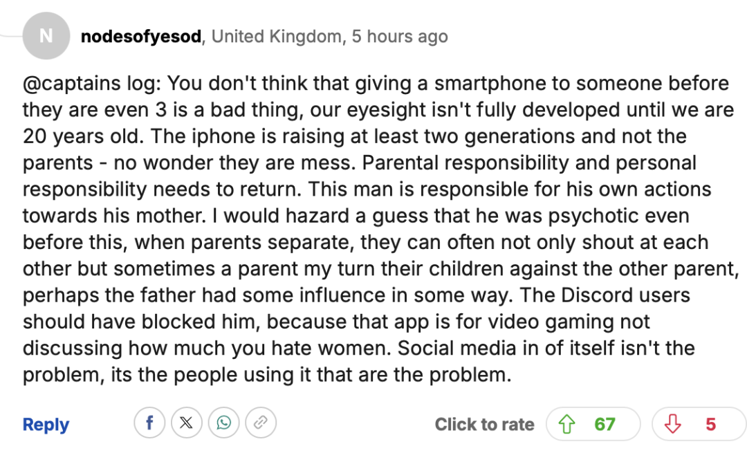 Discord平台应该屏蔽他,因为那个应用是用来玩游戏的,不是用来讨论你有多恨女人的。社交媒体本身不是问题,问题在于使用它的人。”