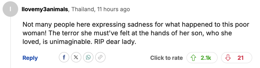 “这里很少有人对这位可怜的女人表示同情!她被自己深爱的儿子杀害,那种恐惧难以想象。愿她安息。”