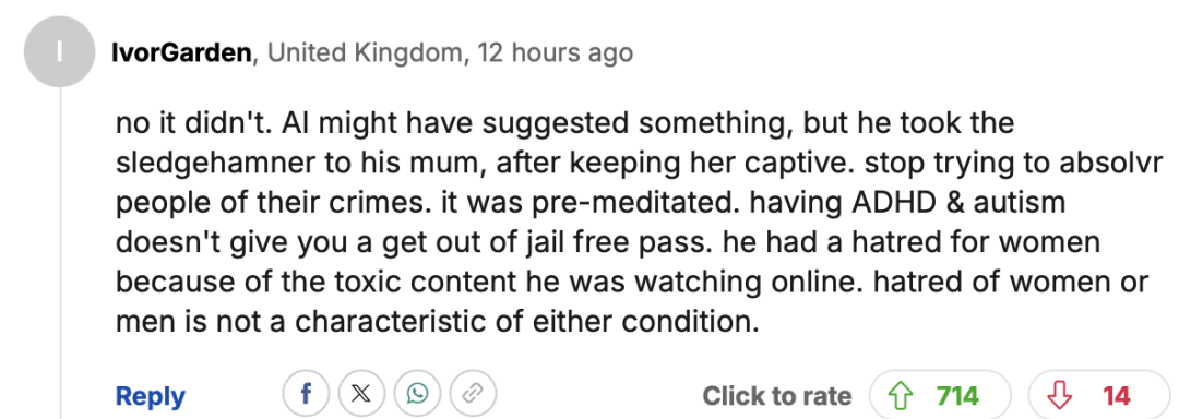 “不,并非如此。他在囚禁母亲之后,用大锤砸死了她。别再试图为他们的罪行开脱了。这是预谋已久的。患有注意力缺陷多动障碍(ADHD)和自闭症并不能让你免于牢狱之灾。