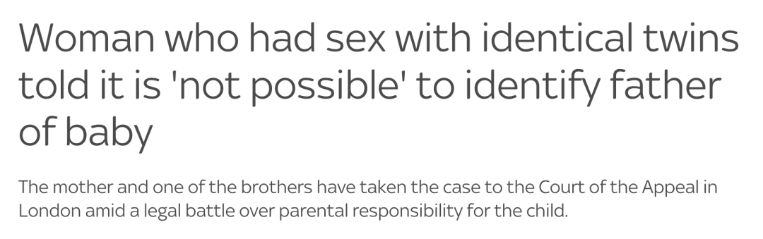 如果有人问:“孩子的亲生父亲是谁?”这原本应该是一个再清晰不过的问题。毕竟在今天,DNA检测几乎被视为“终极答案”,准确率几乎接近100%。但英国法院近期判决的一起案件,却被这个问题狠狠难住了。英国一位母亲同时与一对同卵双胞胎兄弟发展亲密关系,后续诞下女儿,而DNA检测显示:两个男人,都有可能是父亲,法院最终不得不承认:现在的科学,真的分不出来。这起案件甚至一路被闹到上诉法院,并被法官形容为“极其罕见,甚至可能是首例”。事情要追溯到2017年。这名母亲与一对同卵双胞胎相识相恋,并分别与两人发展了关系。起初因为兄弟二人实在长得太像了,这名母亲一度无法分清二人,而这对兄弟,对此更是毫不知情。直到后来,事情才逐渐“撞车”。2018年,她生下了一名女儿,而问题也随之出现:孩子的父亲,到底是谁?但真正让问题变得复杂的,是时间点,在受孕的关键阶段,这名女性在短短四天内,先后与两位兄弟发生了关系。在第一次产检做B超的时候,两兄弟才发现了彼此的秘密:原来二人一直在和同一个女性交往。真相曝光后,兄弟俩爆发激烈争执,互相battle猜测谁才是孩子真正的生父。而最关键的巧合,也成为整个案件的核心难点:医学判定的受孕四天关键窗口期内,这名母亲先后与双胞胎二人都发生了亲密关系。时间高度重合,没有任何时间差可以区分血缘归属。这件事也逐渐撕裂了原本关系亲密的兄弟关系。从情感纠纷,到身份争夺,这个问题很快走向了法律层面。孩子出生后,母亲选择继续和其中一名双胞胎保持亲密关系,并且在女儿的出生证明上,登记这名男子为法定生父。按照英国原有法律,一旦登上出生证明,这名男子自动拥有孩子的法定监护权。但另一名双胞胎兄弟突然提出异议,主张自己才是孩子的生父,按理说,这样的争议只需要做亲子鉴定就能解决。但当检测结果出来时,所有人都愣住了,两位兄弟的检测结果,都显示“符合父亲条件”。原因其实并不复杂:同卵双胞胎来自同一个受精卵,DNA几乎完全一致。普通的亲子鉴定,依赖的是DNA片段的匹配,而在双胞胎身上,这种方法几乎失去区分能力。于是科学只能给出一个模糊答案:父亲就在这两个人之间,但无法确定是哪一个。既然普通 DNA 检测没用,难道没有更精密的检测方式吗?答案是:有,但门槛极高。唯一能区分同卵双胞胎基因差异的方式,是全基因组测序(whole genome sequencing)。专家解释说,双胞胎之间可能只有极少数基因突变差异,需要在30亿个DNA“字母”中寻找这些差异,几乎是“大海捞针”。而且这项检测的现实门槛令人望而却步:全套检测费用高达9万英镑,对于涉案当事人而言,完全无力承担。更关键的是,即便花费天价检测,也无法保证最终能得出明确结论,依旧存在无法判定的可能。随着争议升级,案件最终进入英国上诉法院审理。难题不再只是私人情感纠纷,而是变成科学短板与法律空白的双重考验。相关专家直言:从业多年,从未见过如此复杂又特殊的案件。一旦无法确认生物学父亲,这个孩子往后成长里,或许只有母亲一人能拥有合法监护权。放眼全球,相似案件也有先例:2019年巴西也曾出现同款纠纷,一对同卵双胞胎同时拒绝认亲,DNA 无法分辨,最后法院判决两人共同承担抚养费。参考海外判例与本土现状,英国上诉法院给出了一个相对“现实主义”的裁决:出生证明上的父亲身份可以暂时保留,因为有50%概率他就是生父,法院无法认定他绝对与孩子无关,不会做出否定判定;但与之相关的法定监护权将被暂停。取消他对孩子生活、教育的一切决策权限。法院在判决中坦言,未来随着科技发展,或许有一天可以确定真正的父亲,但在当前阶段,这种可能性成本过高且结果不确定。因此,法院给出了一个颇为罕见的表述:这个孩子的“真相”是“二元的”。也就是说,她的父亲是这两个人之一,但并不存在一个可以被确认的唯一答案。至于如何在成长过程中理解这一点,法院认为,应由母亲来决定如何向孩子解释。当DNA无法区分,当法律无法裁定,世界只能接受一个“不确定的答案”。而在这样的不确定中,或许真正重要的问题已经不再是“谁是生物学上的父亲”,而是谁愿意承担起成为父亲的责任。