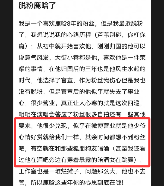 近期一个自称鹿晗八年老粉的粉丝发文宣布脱粉,从多个角度控诉鹿晗,埋怨鹿晗在巅峰期不管不顾官宣恋情,拖事业后腿;