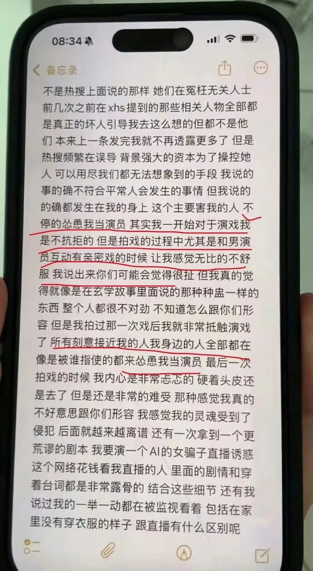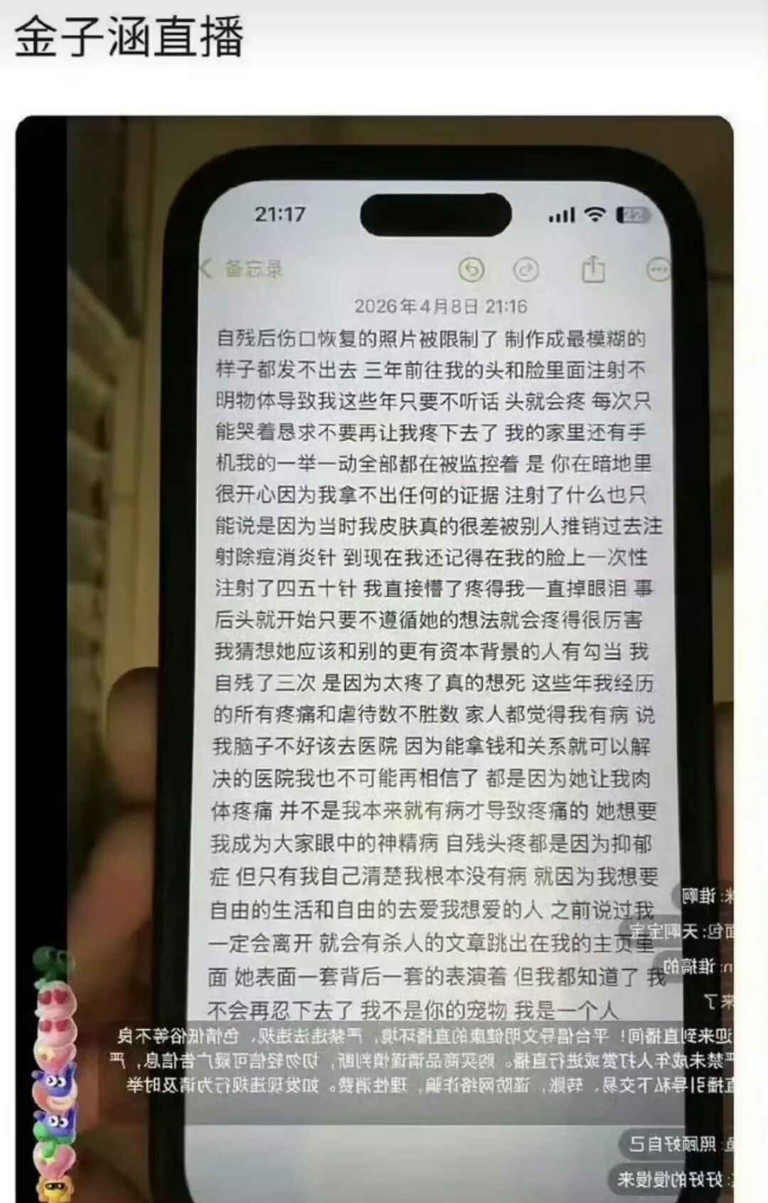 她当下不只是身体上的不适,看她的描述就能知道,语无伦次,逻辑混乱,话都说不明白,她觉得自己被人下蛊了,被人长期监视,这更像是遭受了迫害后的ptsd,精神分裂、被害妄想症的症状(金子涵宣布退圈那会就有严重的抑郁症了,看来她这病情是持续恶化了),就看她后面能不能稳定病情,列出证据,把详细内情说出来了,不然她很容易被乐华的公关部打成“疯子”,在网上彻底噤声。