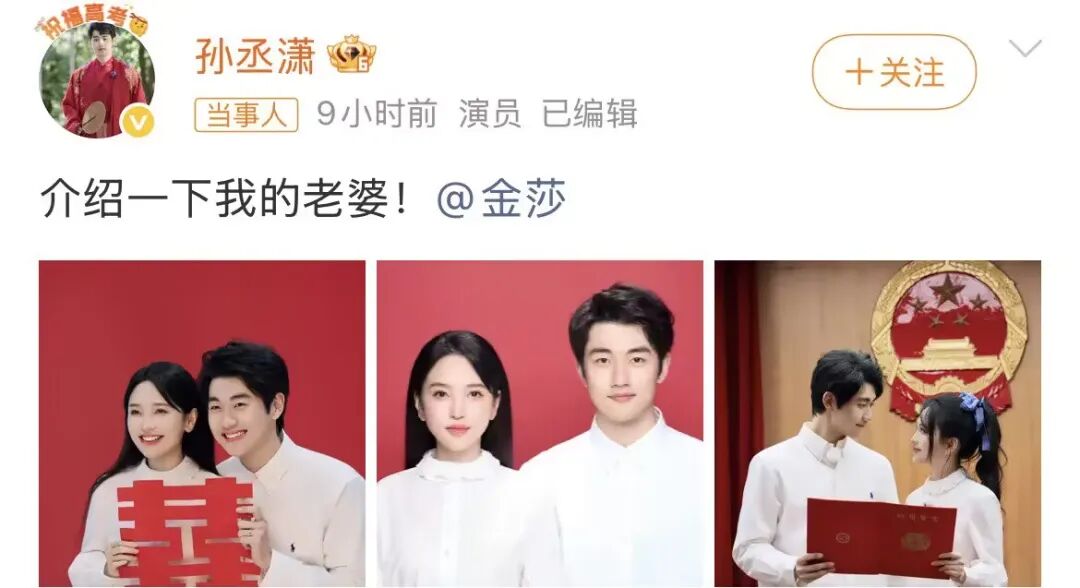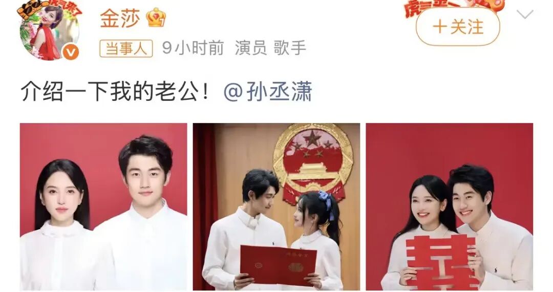 前几天叔就说过,金莎孙丞潇私底下领证了,果不其然,9日,这两人正式公开了这个消息,发了不少甜蜜通稿,姐弟恋真爱cp搞起来,一时间网友都挺感慨,表示所有人都不看好他们,偏偏他们最争气。