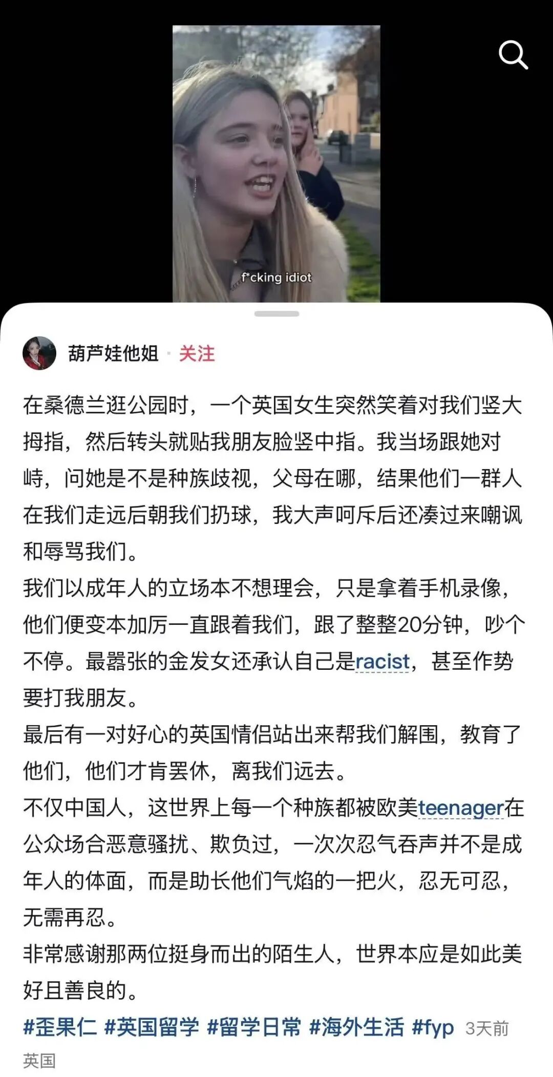 据当事人描述,他们在公园遇到这群青少年时,起初一名英国女生假意竖大拇指,转头就贴脸比中指挑衅,留学生上前对峙质疑种族歧视,对方却变本加厉:扔东西嘲讽、辱骂,还一路尾随20分钟,其中一女生还公然承认自己是种族歧视者,甚至作势要动手。