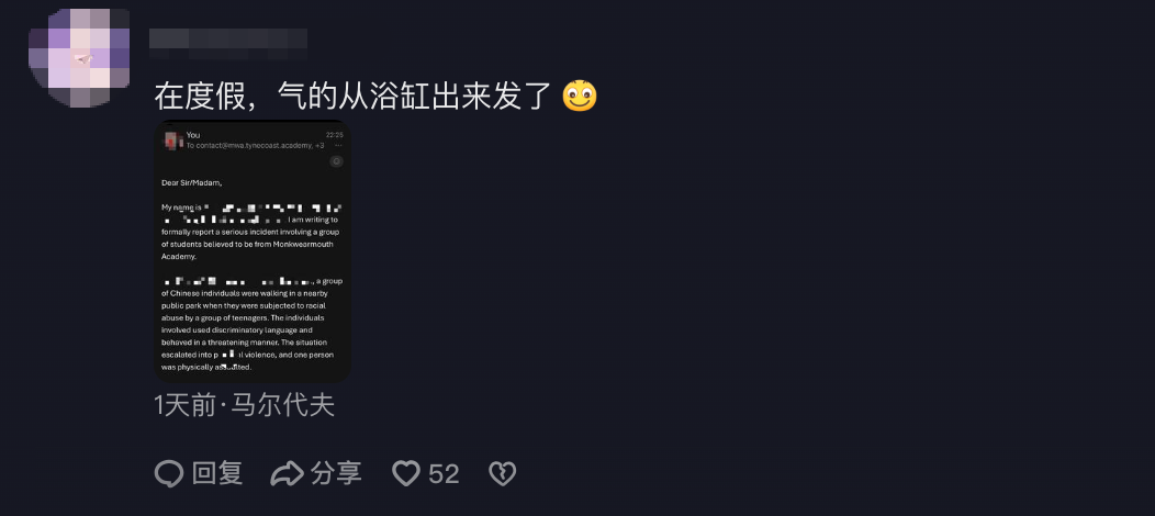 近日,几名中国留学生在英国桑德兰的一座公园散步时,遭遇了一群英国青少年长达20分钟的恶意骚扰+种族歧视。