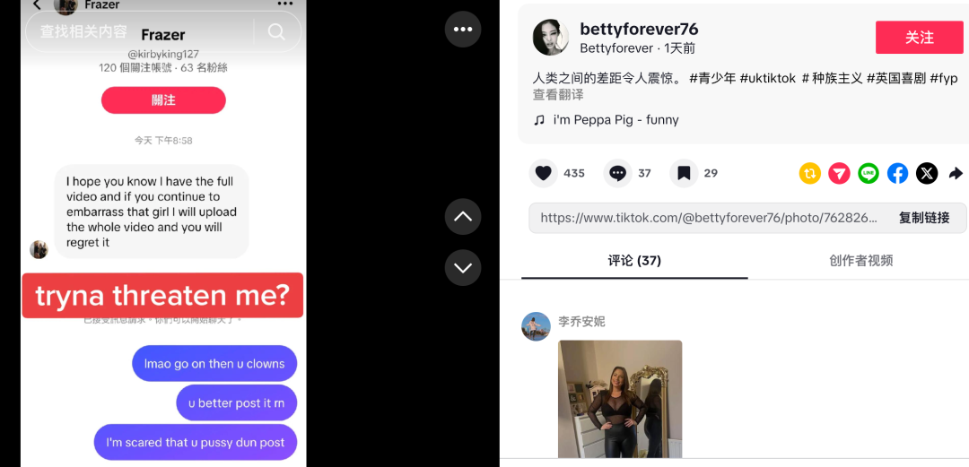 当事人将视频在TikTok上公布后,甚至还收到了威胁私信: