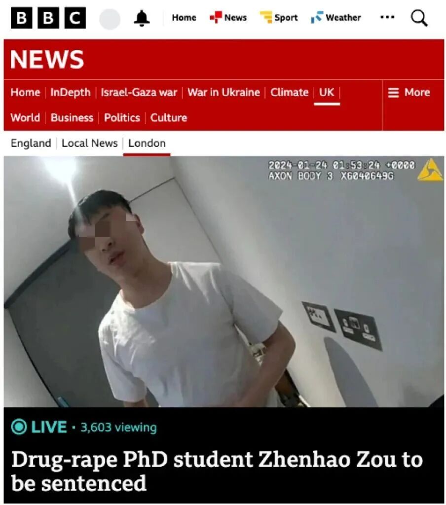 年仅27岁的中国留学生 Zhenhao Zou(邹某)因涉嫌多起对女性实施性暴力、迷奸、偷拍等恶性行为,被英国法院判处无期徒刑,最低服刑24年